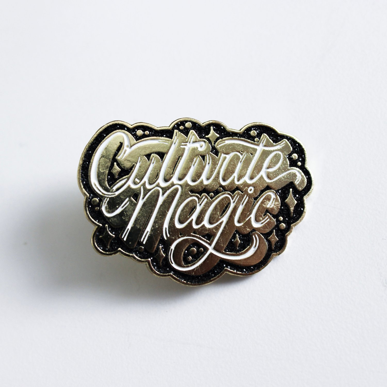 This Cultivate Magic pin serves as a great reminder to do just that. This design is a spin-off of the "Cultivate Magic" print, made with white and sparkling-black acrylic.